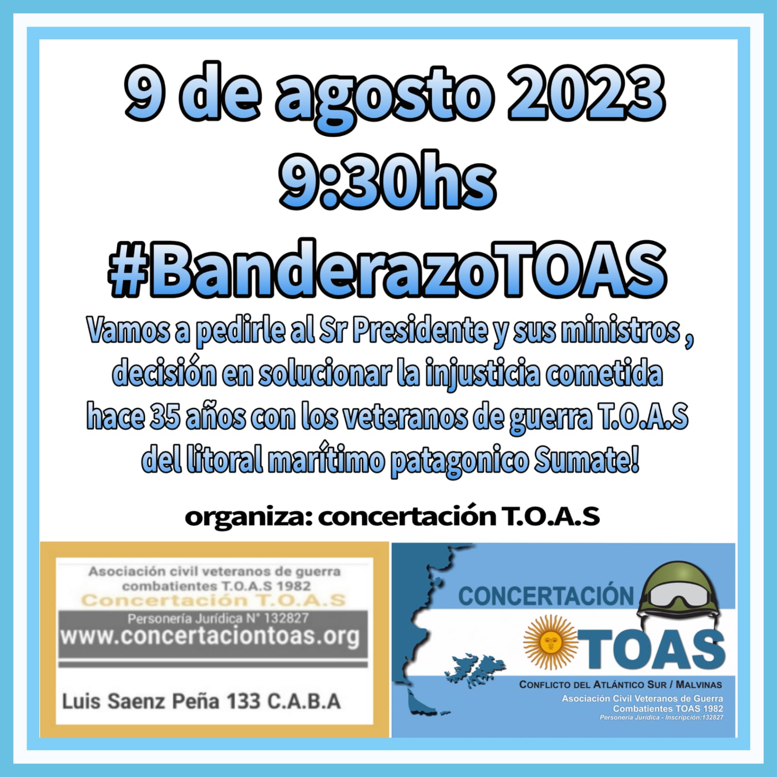 Los VGM TOAS de toda la Argentina están convocados para este miércoles 9 de agosto, saliendo de la sede capital, a protagonizar otro nuevo "banderazo" con el férreo reclamo para recuperar la veteranía de guerra arrebatada, hace 35 años, a los soldados que defendieron el Litoral Marítimo Patagónico y evitaron la invasión inglesa a las tierras del sur continental.