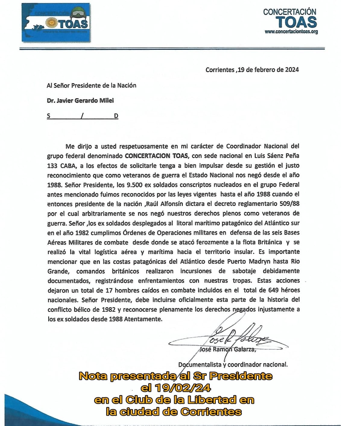 Me dirijo a usted respetuosamente en mi carácter de Coordinador Nacional del grupo federal denominado CONCERTACION TOAS, con sede nacional en Luis Sáenz Peña 133 CABA, a los efectos de solicitarle tenga a bien impulsar desde su gestión el justo reconocimiento que como veteranos de guerra el Estado Nacional nos negó desde el año 1988. Señor Presidente, los 9.500 ex soldados conscriptos nucleados en el grupo Federal antes mencionado fuimos reconocidos por las leyes vigentes hasta el año 1988 cuando el entonces presidente de la nación ,Raúl Alfonsín dictara el decreto reglamentario 509/88