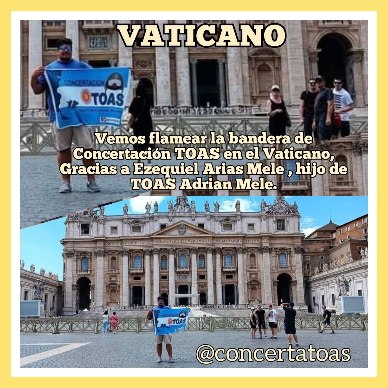 El hijo del VGM TOAS, Adrián Mele, Ezequiel llevó hasta la plaza principal del Vaticano la bandera de la lucha de los aún no reconocidos que dieron su vida y su salud física y emocional luchando por evitar la invasión inglesa al litoral marítimo patagónico.